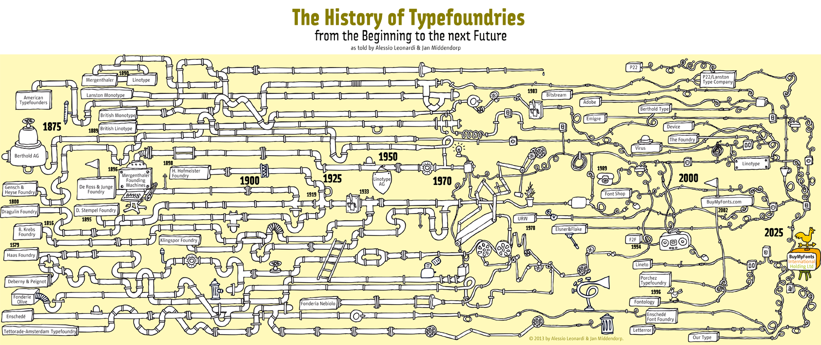 Today, it is hard to imagine what a sensation the Linotype caused; few people realize what landslide changes Mergenthaler’s invention brought to written communication. That’s because it was 120 years ago, and so many things have happened since. To mention a few: the Improved Linotype, the erection of the Eiffel Tower, the first World War, surrealism, the puppet shows and type designs of W.A. Dwiggins, Times New Roman, World War Two, the careers of Hermann Zapf and Adrian Frutiger, the coming of Helvetica, the Cold War, James Bond, the advent of photo-typesetting, the death of photo-typesetting, the May 1968 uprising, the advent of laserfonts, the death of of laserfonts, the advent of PostScript, the death of… well no, not just yet. And finally in 2006, Linotype’s jubilee year, the friendly takeover of the company by its old competitor, Monotype Imaging.